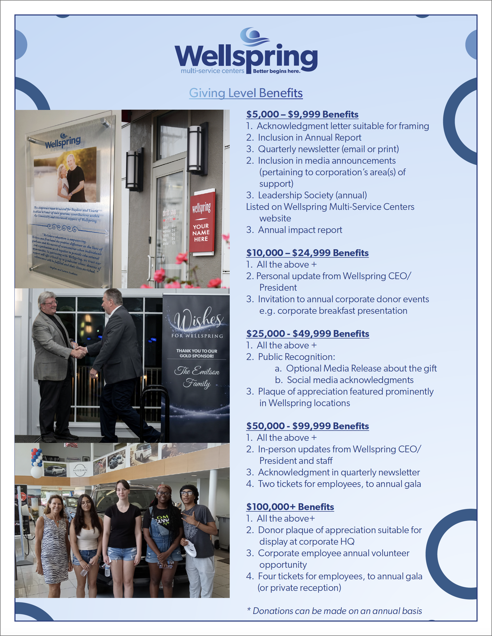 Wellspring Multi-service Centers is coming up on their 40th year of serving clients on the South Shore. With two locations in Weymouth and Hull, our mission is to provide support and skills to people facing challenges to their well-being in order to help them achieve independence and self-sufficiency. Corporate philanthropy is critical to the programs and services Wellspring provides on a daily basis, from providing transportation to our students to feeding families in our community, we uplift and empower those in need.