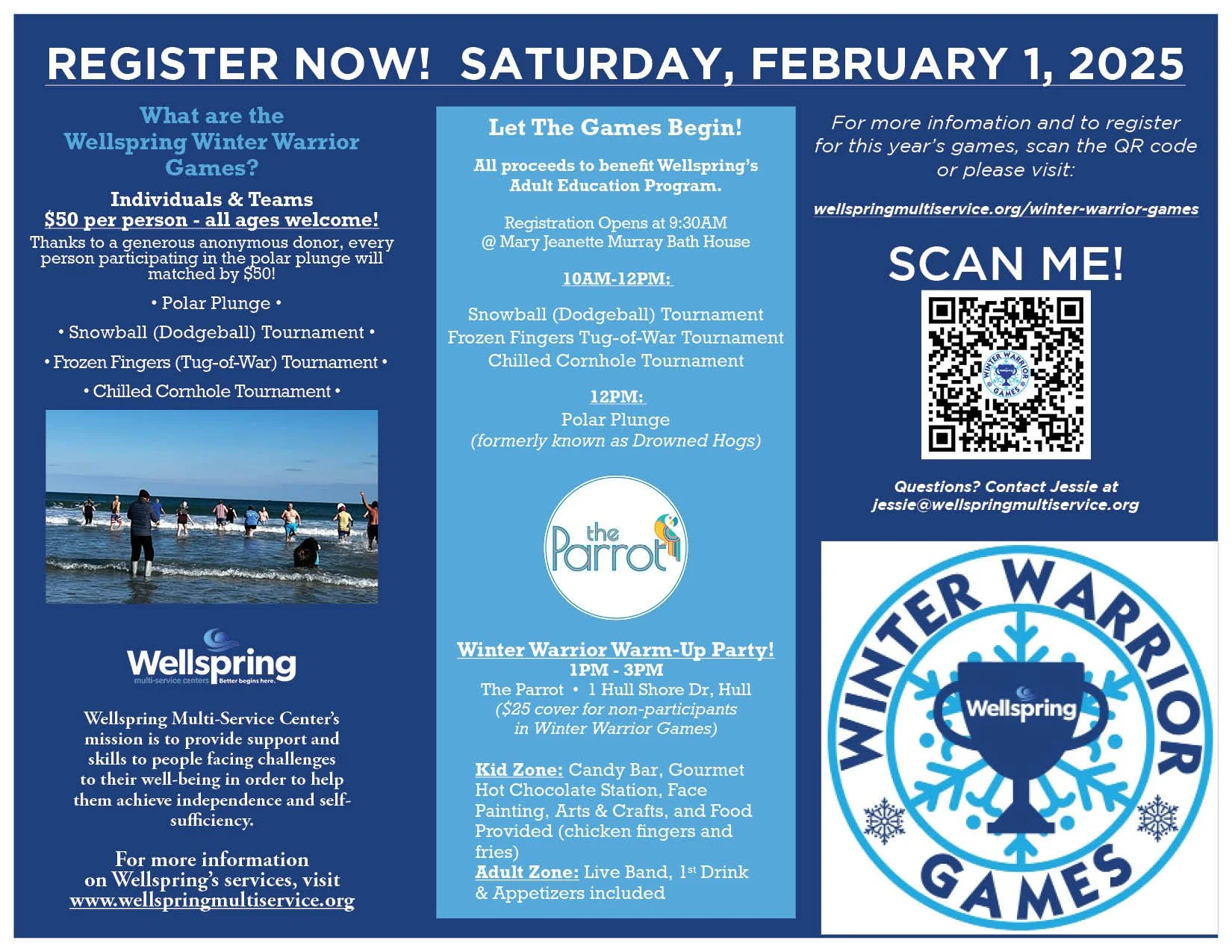 Almost 30 years ago, residents of Hull began taking the dive in the frigid waters of the Atlantic to raise money for Wellspring Multi-Service Centers. The formerly titled "Drowned Hogs" polar plunge is reimagined and back as the Winter Warrior Games. With a new look and a new focus on families and some friendly competition, we are proud to continue this local, beloved event.